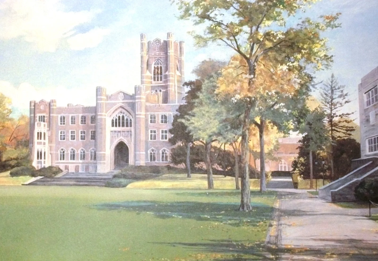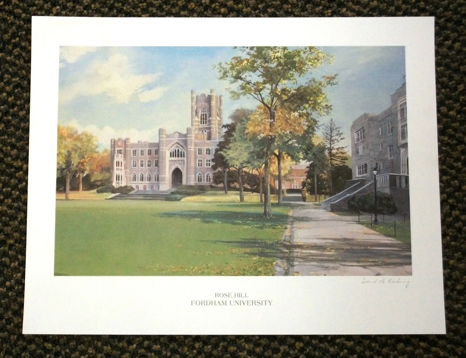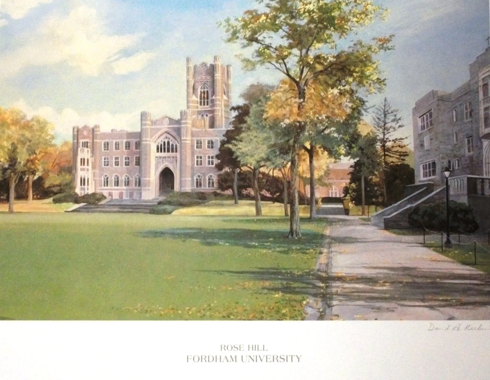 In 1987 Fordham University commissioned this painting of the Rose Hill campus, which highlights Keating and Freeman Halls on a lovely summer afternoon.