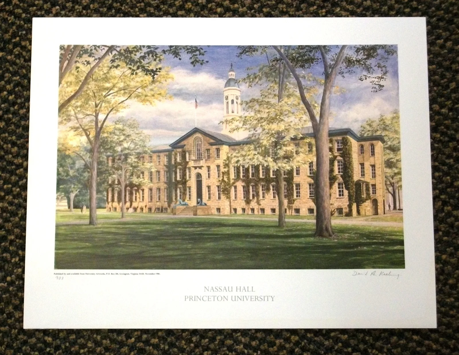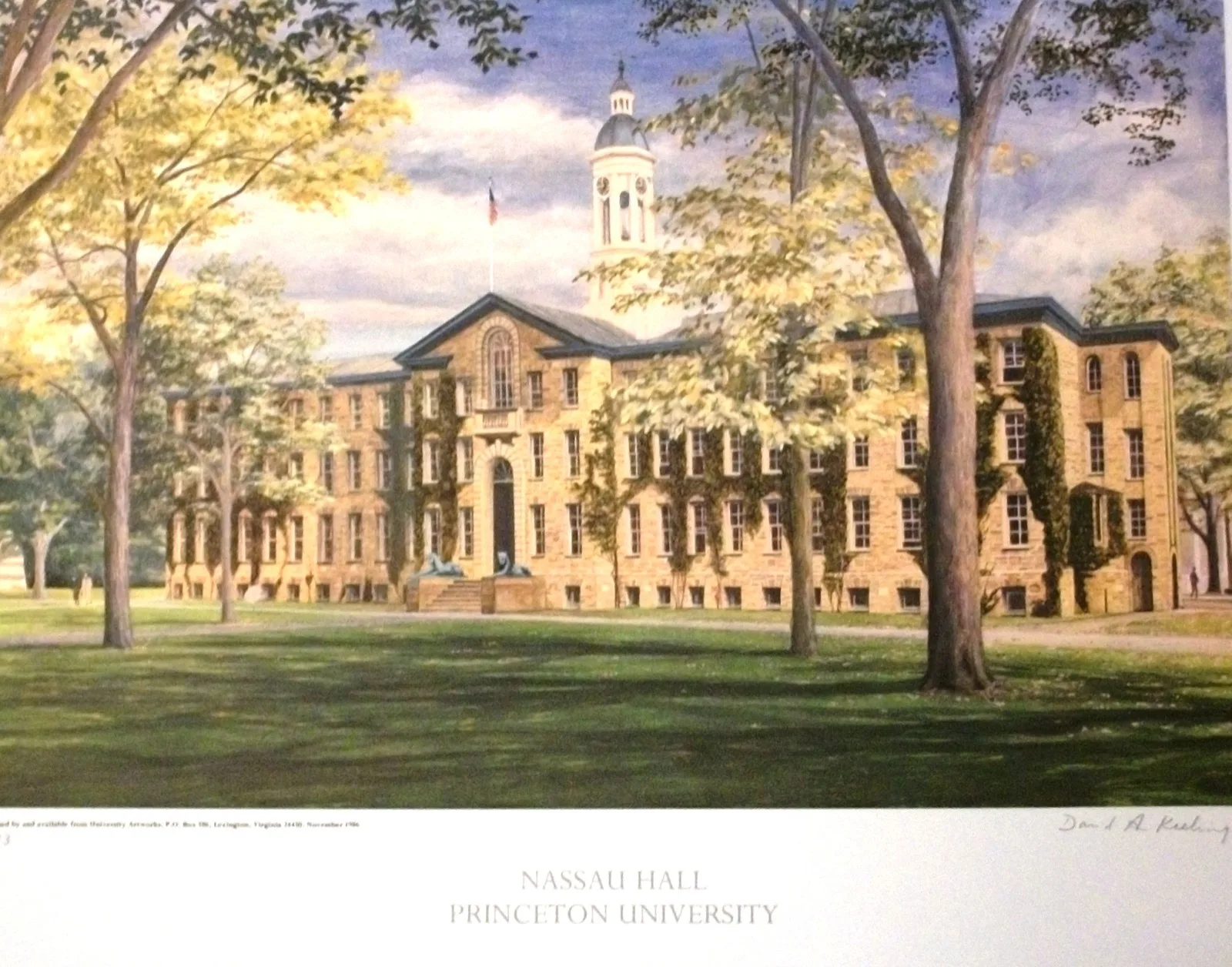 The artist, David Keeling, reproduced the painting as offset lithographs, which were printed on acid-free, museum-quality paper to ensure their color and durability. Each print was signed and double-matted in a gold-lipped, mahogany-stained, wooden molding before being offered to Princeton’s alumni and friends.