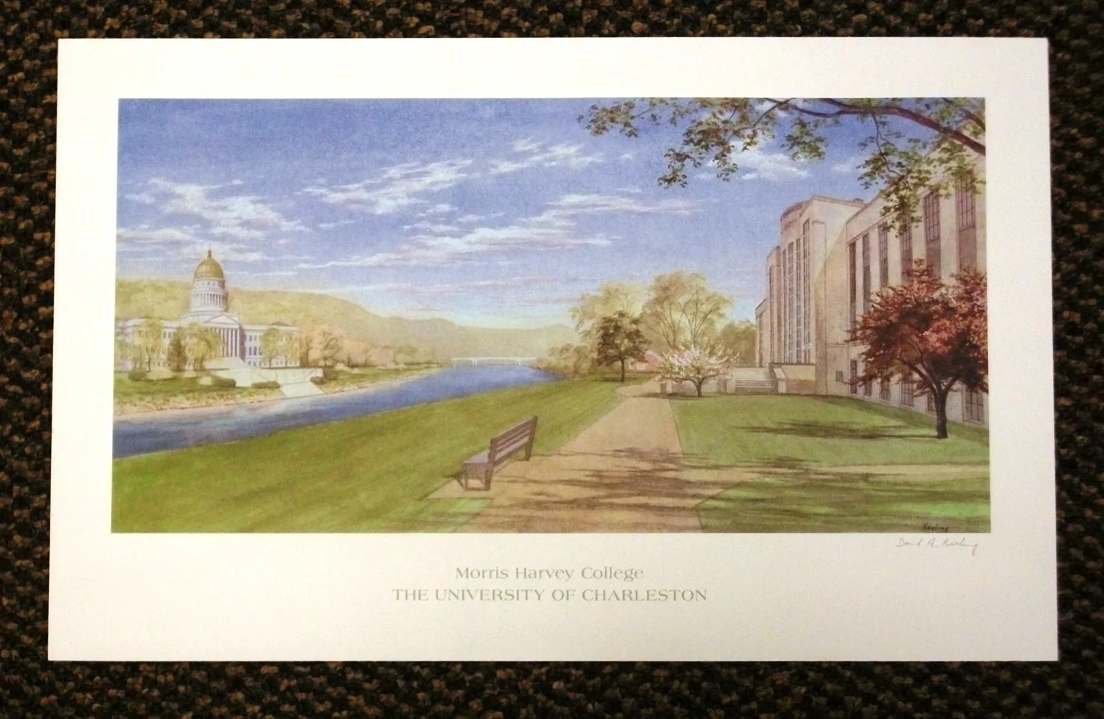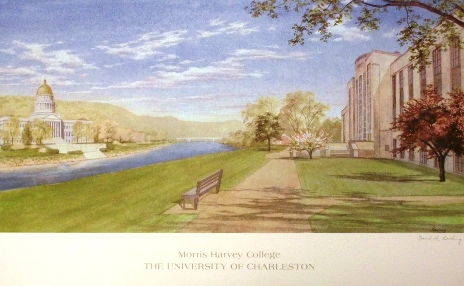 In 1988 the University of Charleston commissioned this lovely painting of Riggleman Hall on a clear spring afternoon, facing the Kanawha Canal and the West Virginia State Capitol building.