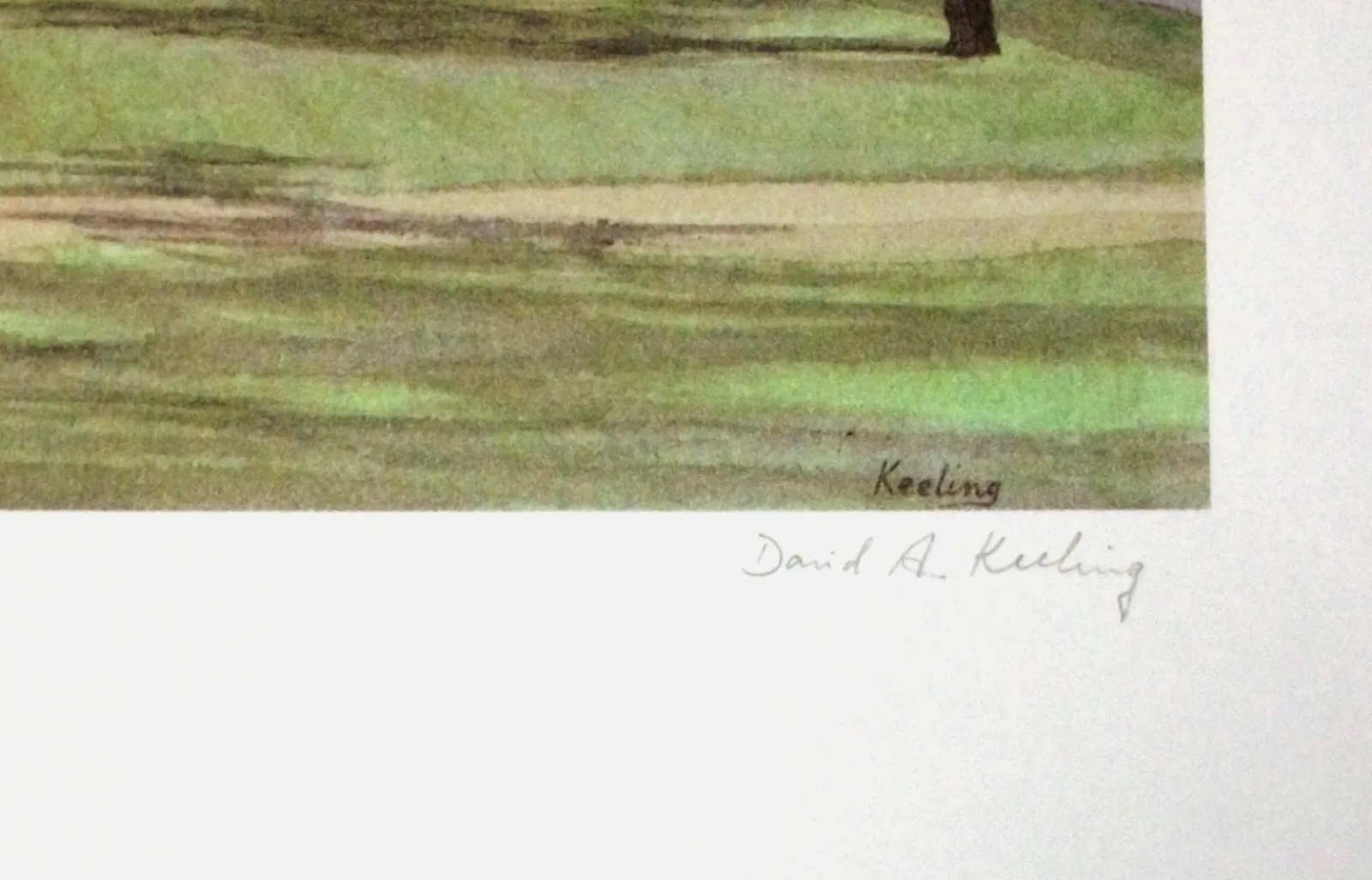 The artist, David Keeling, reproduced the painting as offset lithographs, which were printed on acid-free, museum-quality paper to ensure their color and durability. Each print was signed, double-matted and framed in a gold-lipped, mahogany-stained, varnished, wood molding before being offered by the Office of Alumni Relations to the University’s alumni and friends.